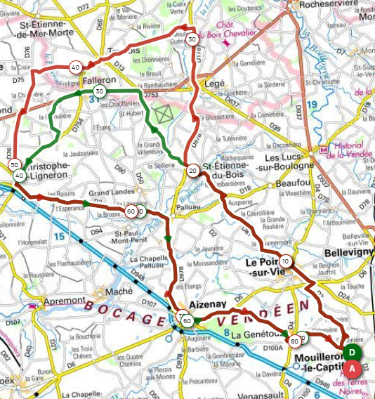 MC – Le Poiré – St Etienne du Bois – Legé – Touvois – Froidfond – St Christophe – Palluau – Chapelle Palluau – Aizenay – Genétouze – MC.