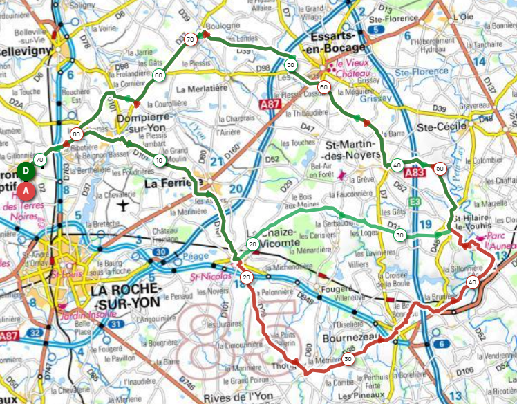 MC – Ribotière – Dompierre – La Ferrière – La Chaize – Thorigny – Bournezeau – St Hilaire le Vouhis – St Martin – Les Essarts – Boulogne – Les Gâts – Cornière – Ribotière - MC