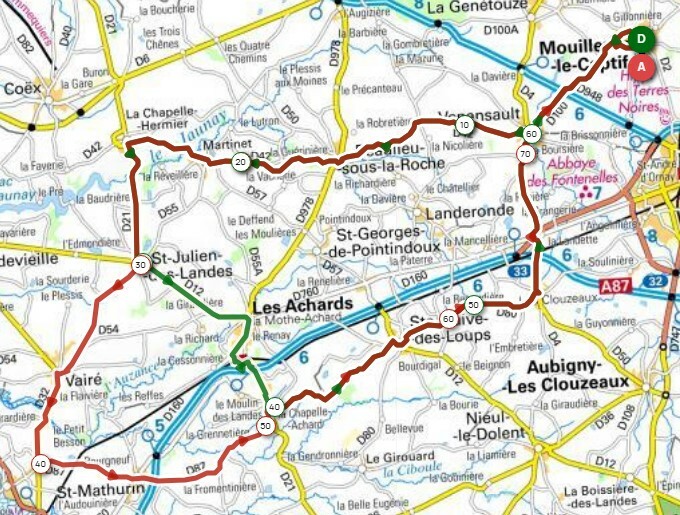 Groupe 1 - 77 km – M.C., Venansault, Beaulieu-sous-la Roche, Martinet, La Chapelle-Hermier, St-Julien des-Landes, Vairé, direction Olonne, à gauche St Mathurin, La Chapelle-Achard, Ste-Flaive-des-Loups, Les Clouzeaux, Venansault, M.C.
